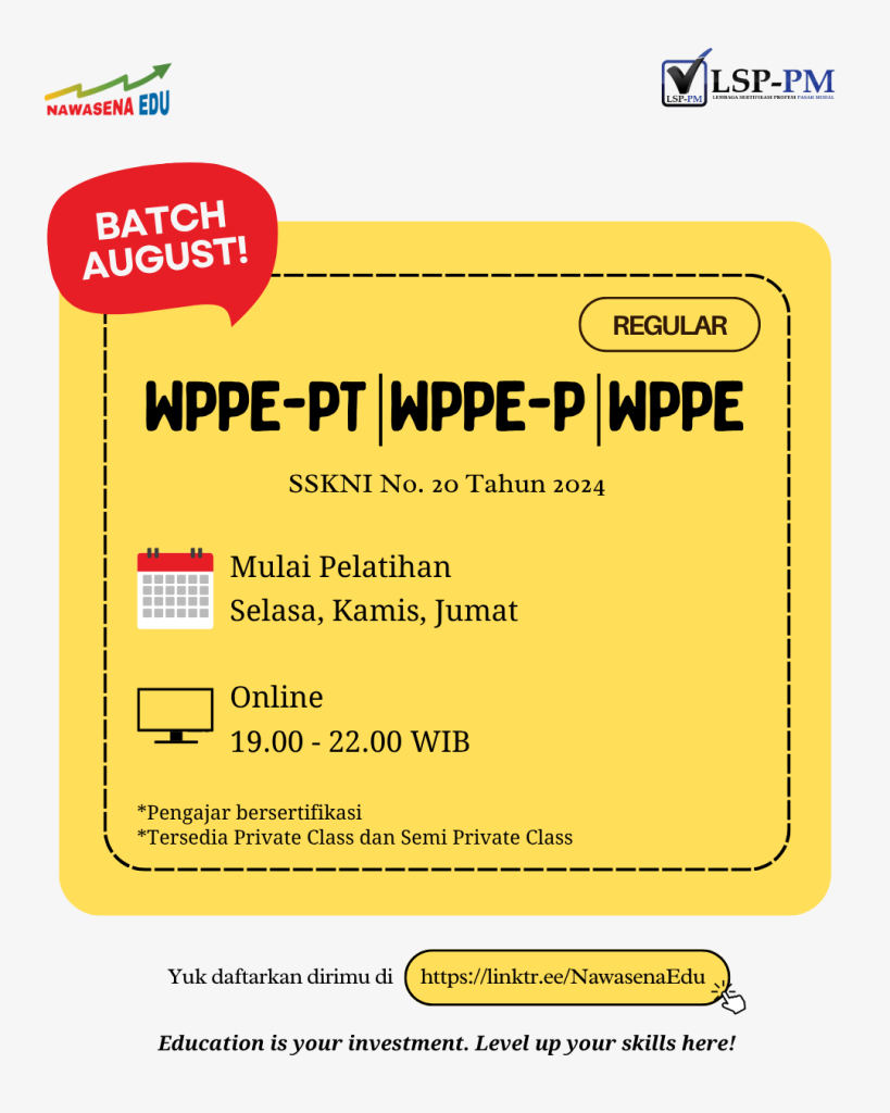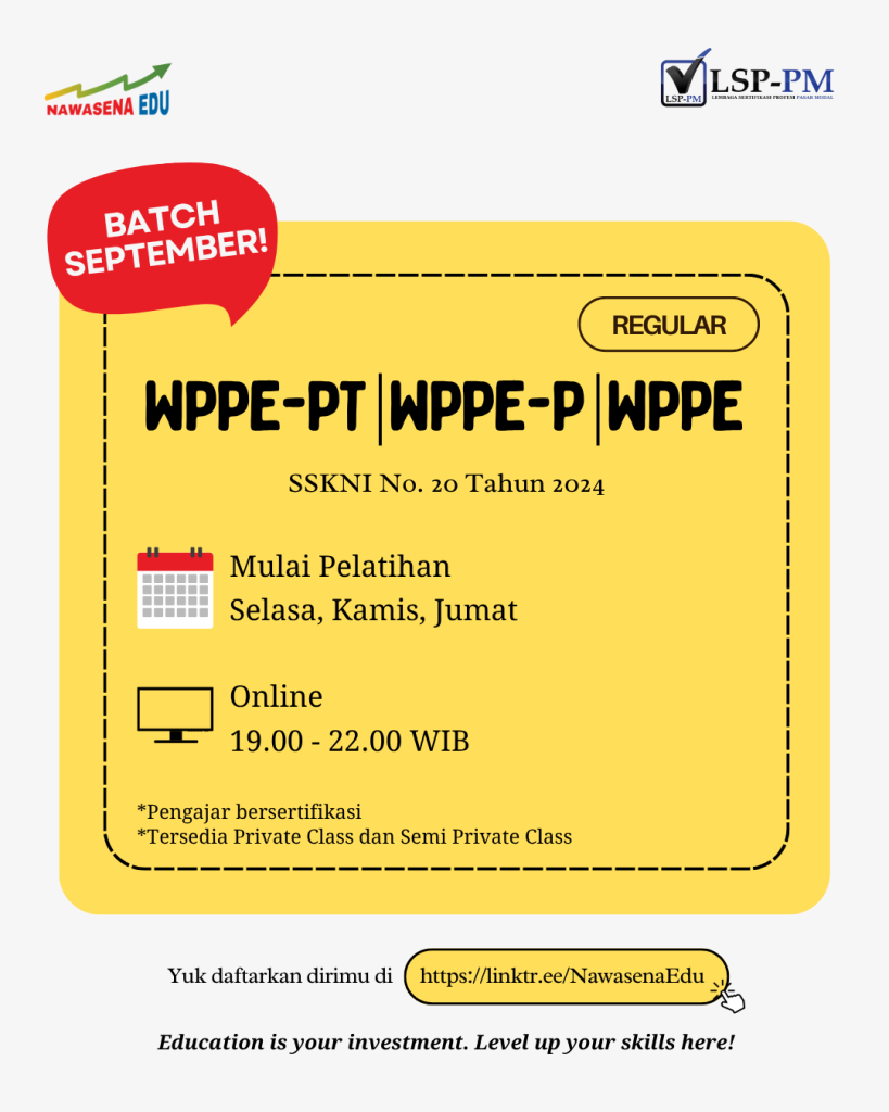 Sertifikasi Wakil Perantara Pedagang Efek (WPPE) ke level tertinggi! Ikuti pelatihan sertifikasi WPPE Jenjang Kualifikasi 5 kami yang dirancang sesuai SKKNI dan KKNI terbaru, sebagai persiapan optimal menuju Uji Kompetensi dan meraih Sertifikasi BNSP WPPE yang diakui secara nasional